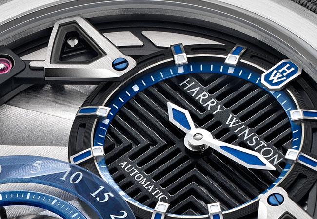 HW2202機芯以4赫茲動力基礎在錶盤下躍動,鏤空白金擺陀更提供長達65小時的動力。扁平狀矽遊絲則確保擺陀運行的平穩一致。腕錶的複雜功能是眾所矚目的焦點,不僅配備偏心時、分指示,逆跳秒針亦獨具特色。蝸形凸輪及回動彈簧系統讓紅色秒針在走完30秒之後,立即返回原點。逆跳秒針的機械構造在弧形秒針盤中清晰可見。橡膠錶帶之上點綴海瑞溫斯頓品牌的標誌性藍色,營造出織品錶帶的質感。