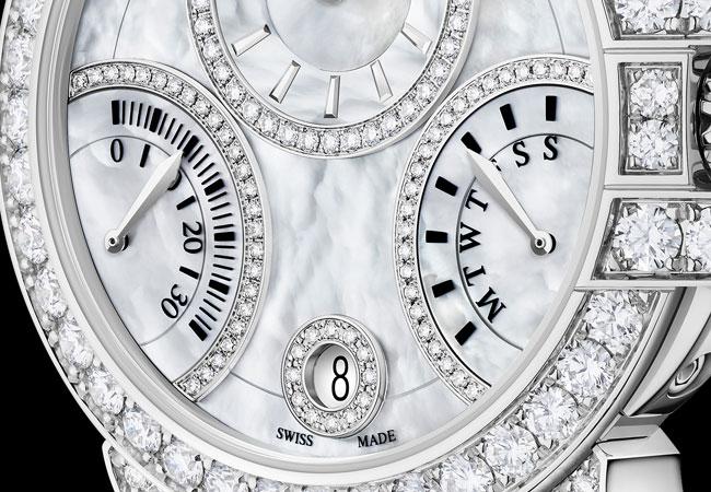 海瑞溫斯頓Harry Winston海洋Ocean系列全新推出兩款兼具優雅和運動感的雙逆跳功能腕錶。珍珠母貝錶盤上鑲嵌圓形明亮式鑽石,搭配18K白金或玫瑰金錶殼令錶盤熠熠生輝。這款腕錶成功結合了配戴舒適、精密工藝以及雙逆跳複雜功能,完美展現追求多重功能的本質所在。