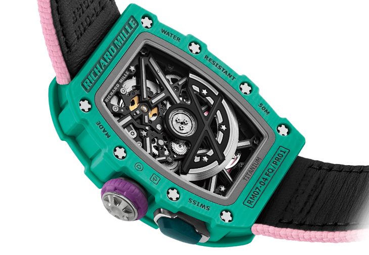 從日常生活的角度來看,RM07-04充滿著RICHARD MILLE的設計語彙,六種色調的繽紛色彩與鏤空機芯奪人眼球;功能操作也有巧思,按壓四時到五時位置的按把就能設定錶冠功能,錶冠功能指針將在H調時、N空檔、W上鍊間移動,不用拉出錶冠即可調校時間或手動上鍊,絕不會傷及漂亮的指甲!實在設想周到。至於內置的CRMA8自動上鍊機芯和高科技材質錶殼製作工藝,將於下篇介紹。
