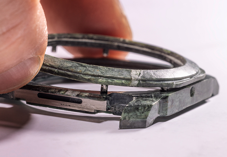 這只獨創腕錶所採用的綠色大理石名為Verde Alpi,取自奧斯塔山谷,是銜接瑞士阿爾卑斯山脈與義大利的一道天然通道。綠色是自然界的主色,象徵著豐碩、生命力與能量。鮮綠色的石材上佈滿交錯的白色紋理,宛若奧斯塔山谷兩側高山森林蜿蜒起伏的雪峰輪廓。這些不規則白色紋理的連續性,產生了令人眼睛為之一亮的視覺效果。