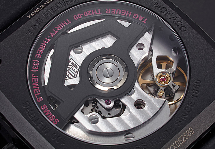 錶款內部所搭載的TH20-00自動上鍊機芯,是由先前的Heuer 02自動機芯所修改而來,主要變動的地方是將原本的單向自動上鍊系統,更改為雙向自動上鍊系統,可提升上鍊效能,在短時間內提供充足的動能;而發條盒同樣具有80小時的動力儲存,機芯採用導柱輪與垂直離合計時結構,能精準的計算時間。