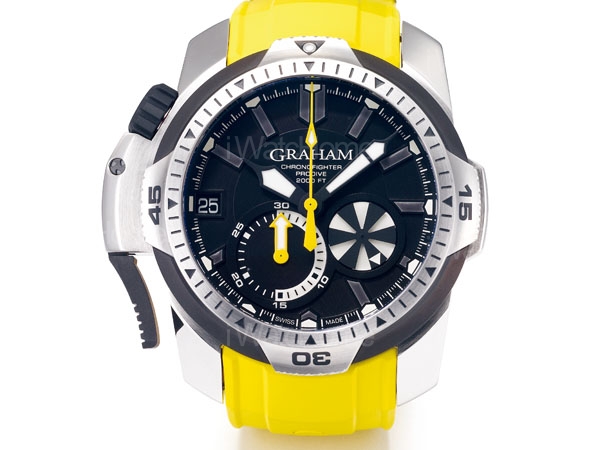 為了配合水下運動的暗潮洶湧,GRAHAM Prodive將招牌、誇張的計時按把設計改得較為低調,配合錶身也更為流線。左置錶冠與按把,設計成槓桿式的按把在施力上相對省力,獨特造型即便戴著手套也能輕易操作,這也是GRAHAM的專利。採用單按把計時,計時僅保留中央60秒與七點鐘位置的30分鐘計時。