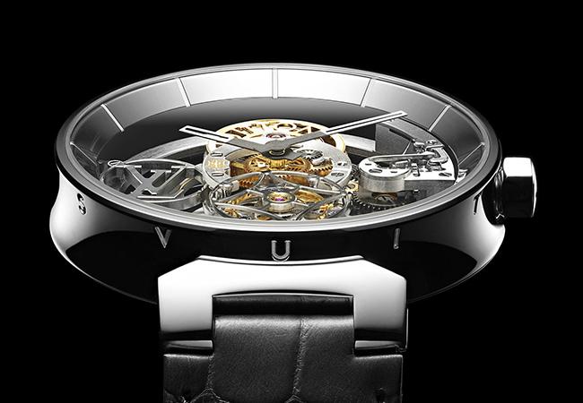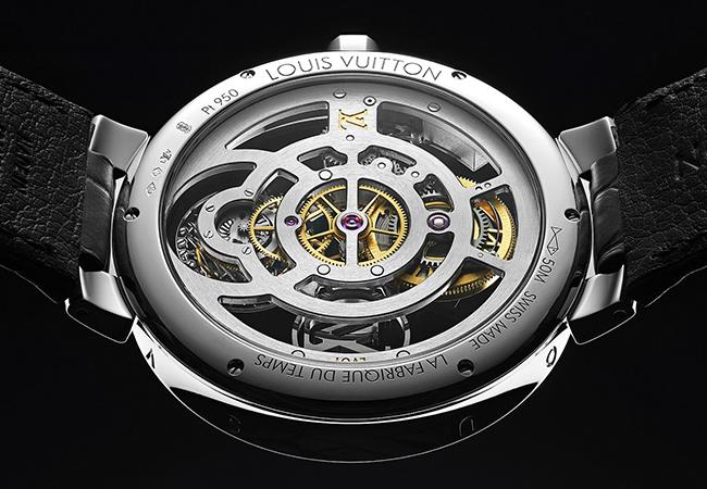 中間的時分顯示;還有6點方向的陀飛輪框架,上面的Monogram花朵圖案向路易威登標誌致敬。單一排列方式以鏤空基板的透明感為基礎,營造獨特美感。發條匣、錶盤、和陀飛輪框架似乎懸浮在無重力的空中。