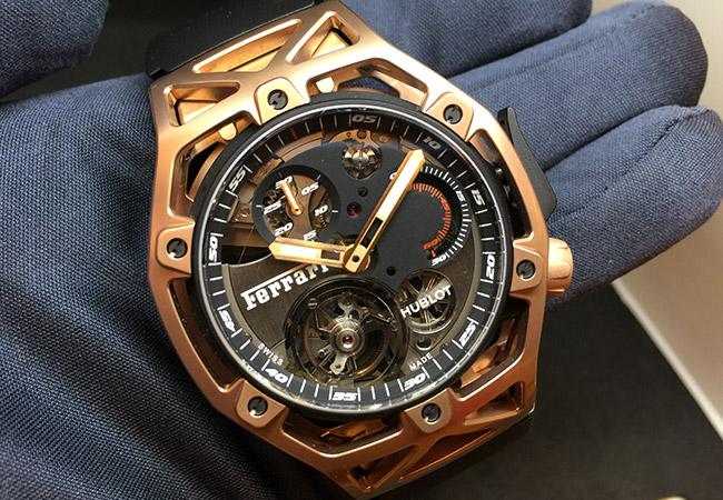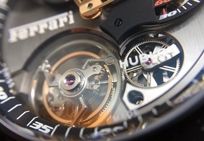 機芯機板以碳灰色鍍銠處理,精心調校的「引擎」以局部鏤空面盤,使得憑空旋浮的陀飛輪顯得格外突出。法拉利的標誌置於9點鐘位置,而HUBLOT標誌則呈現於5點鐘方向,在3點鐘位置呈現以賽車儀表板為靈感的雙30秒計時盤,累計分鐘盤置於11點位置。