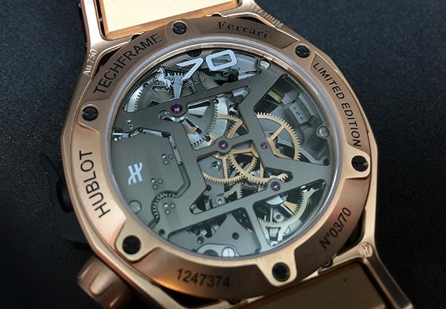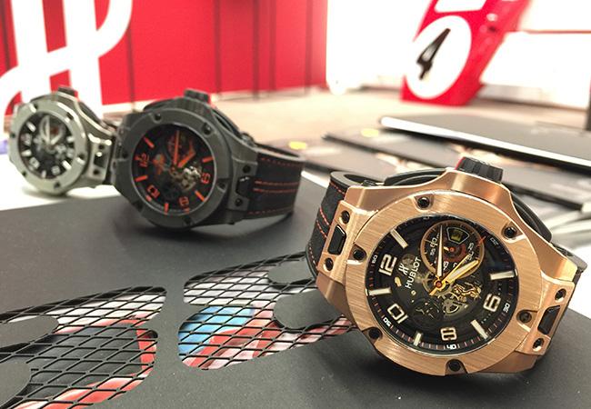除了Techframe Ferrari 70週年陀飛輪計時碼錶,透過Big Bang法拉利腕錶,Hublot開創了Magic Gold魔力金、紅色陶瓷等一系列專利創新材質;此外,MP-05“LaFerrari”腕錶,更搭載了打破世界紀錄的50日動力儲存自製機芯。自2013年起,Hublot品牌標誌即清楚呈現於馳騁F1賽道的法拉利車隊車身和車手服裝之上。