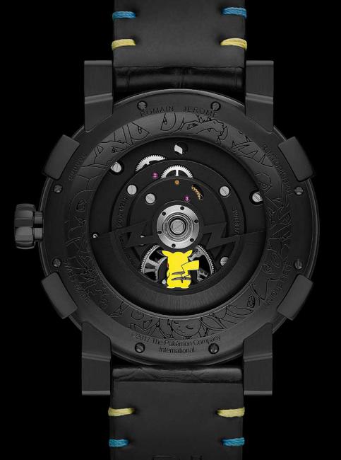 而藏在閃電框架後的就是這顆腕錶的心臟-RJ400-TS自動上鍊陀飛輪機芯。其振頻28,800 vph,擁有60小時動力儲存。錶背則能看到背對畫面的皮卡丘,宛如看著前面的夥伴們。