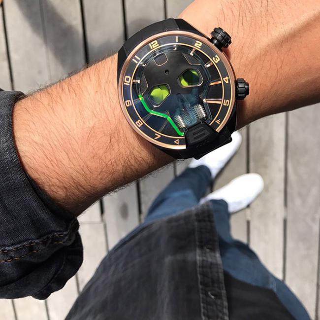最後,為使創新水準更進一步,HYT又在此基礎上添加了第三種創新:首度為高級鐘錶作品設計的機電光源。6點鐘位置的構件下方設置了兩個LED燈。它們以手動方式開啟,能照亮整個腕錶內部。在這一光源的照耀下,含有特製螢光染料的綠色液體緩緩流動,生動而富有朝氣!同時,燈光緩慢流入骷髏的每一個角落和縫隙,令這一鏤空結構仿若煥發了生命—顛覆製錶成規。