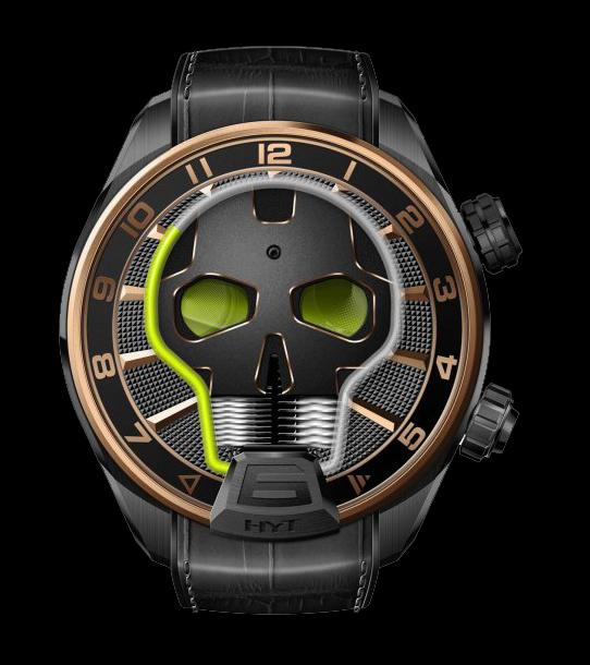 HYT為逼真骷髏造型Skull系列研製了一種新的毛細管。其完美勾勒出骷髏輪廓,佔據腕錶中央位置。骷髏右眼處的托座設有動力存儲指示器,隨著腕錶65小時動力存儲的慢慢耗盡,該指示器也會逐漸變暗。而左眼托座設有秒鐘指示器。這兩個指示盤持續旋轉,令腕錶仿若具有了生命。骷髏造型本身由黑色DLC鈦金屬製成,裝於飾有巴黎格紋飾釘圖案的面盤上。其每一條輪廓線都採用了5N金手工倒角工藝。錶圈和時標也採用了同樣獨特的修飾。