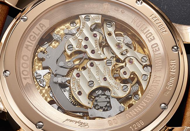 2017年蕭邦為九十周年的Mille Miglia推出玫瑰金限量版,搭載自家Fleurier製錶工坊自製的L.U.C 03.07-L機芯,C.O.S.C.瑞士官方天文台認證,加上日內瓦印記的背書,是L.U.C機芯中等級頗高的作品,不過並不是今年推出的新機芯,2014年的L.U.C 1963計時碼錶就曾出現過,導柱輪結構加上垂直離合,歸零的瞬間作動頗為滑順,蕭邦去年紀念L.U.C系列二十周年的Perpetual Chrono錶款,搭載的萬年曆計時碼錶機芯L.U.C 03.10-L,就是以L.U.C 03.07-L為基礎改制的。