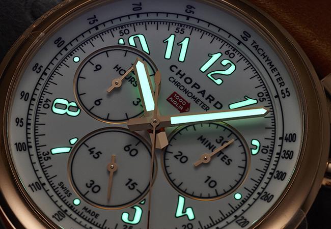 Mille Miglia其實之前就出過很近似的設計,乍看之下只有面盤顏色或錶殼材質不同,但其實三眼計時盤的位置配置、面盤外緣測速計的數字寫法、還有錶徑尺寸、搭載的機芯都不一樣,今年的紀念版也沒有日期的功能,但算是細節進化的升級版本,以外型來說跳脫了以往的運動感,而以顏色的配置填入古典元素,和古董車的形象更為相符。