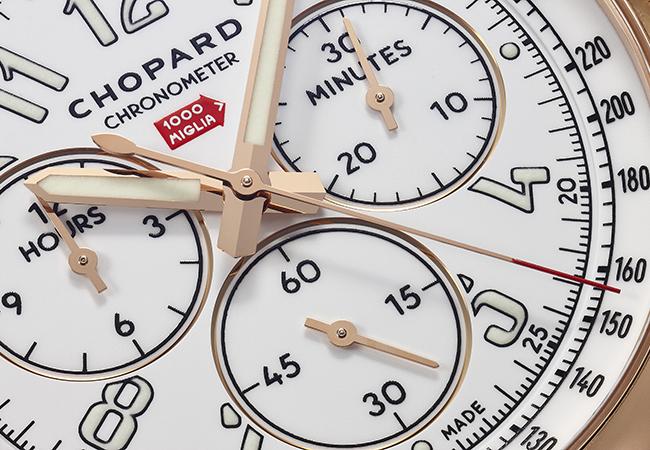 Mille Miglia Classic XL腕錶以白面搭配玫瑰金錶殼,錶殼和錶耳的線條都很圓潤,按把設計的靈感則是源自跑車的引擎活塞、大型的錶冠設計也是來自汽油蓋的發想,其上的槽紋增加了手指在操作時的摩擦力,車手們即使戴著手套也可以直接操作,和飛行錶的洋蔥型大錶冠是異曲同工的原理,而三個計時盤也是汽車儀表板的概念復刻,外圈和時標銜接的位置,也鍍上一圈金環,強化外框做出和主面盤的區隔。