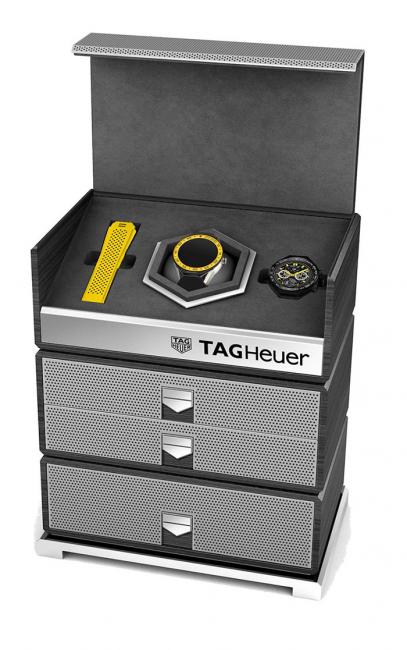義賣套組包括全新TAG Heuer Connected Modular 45智能腕錶,以及Heuer-02T COSC陀飛輪計時碼錶可拆換錶頭。兩者皆具備象徵Only Watch的黑色與黃色。