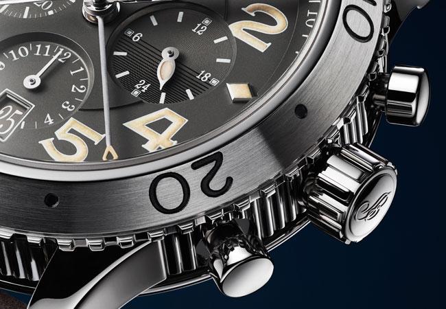 Type XXI 3817飛返計時碼錶採用寶璣經典的錢幣紋錶殼,搭配煤灰色面盤,復古色調的指針與時標。具備飛返計時碼錶功能,在啟動計時之後,只要按下4時位置的按把,計時指針就可以立即歸零並重新計時。她的計時指針與小針盤的設計也與一般不同,計時秒針與計時分針都是大型指針並與時、分指針同軸,計時小時針盤則設於12時位置。3時位置安排的是日夜顯示,9時位置是走時小秒針盤。