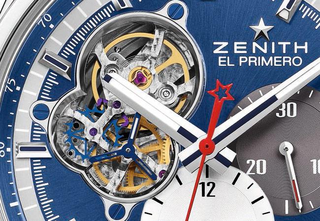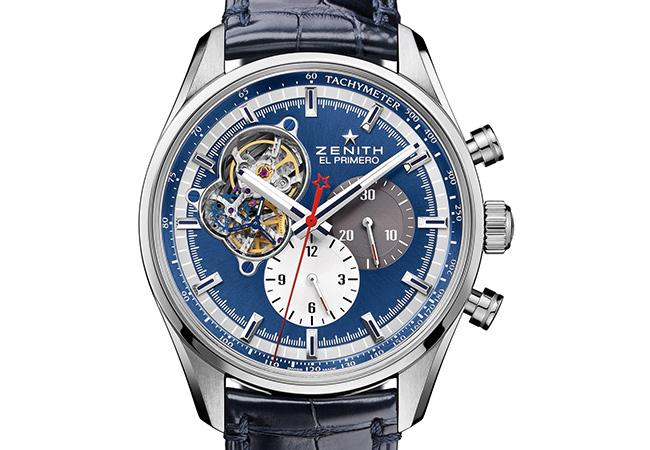 ZENITH El Primero Chronomaster計時碼錶搭載El Primero 4061型自動上鍊機芯,不鏽鋼錶殼搭配深藍面盤,測速錶圈則以淺灰呈現。腕錶也擁有不同顏色來點綴,其中三點鐘位置的30分鐘積算盤以灰色呈現,6點鐘位置的12小時積算盤為白色,加上中央計時秒針尾端的紅色星型造型,以及鏤空黃色擒縱輪系,讓腕錶更加色彩繽紛,卻也不會搶去主色深邃藍面。跟著高振頻,出發迎接周末囉!