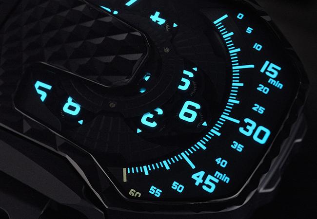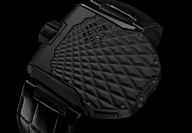 錶頭正面是URWERK招牌的衛星轉軸時間顯示,翻轉之後並非透明底蓋,而是品牌近期頗為愛用,彷彿恐龍皮膚的強悍花紋。而URWERK也在這風格強烈的黑色底蓋中藏了個小小心機。若仔細觀察,當可察覺十二點位置的網狀鏤空中,若隱若現地藏著一枚閃動金光。這是一枚與自動盤連動的渦輪葉片,也是URWERK頗具代表的結構。這是為了調整自動盤上鍊效能所開發的機制,運用渦輪葉片轉動時造成的風阻降低自動盤運轉的力道。最初出現在UR105上,採取的模式是可以讓配戴者自由選擇,動力滿載,或激烈運動時可以暫停自動盤轉動。動力不足,又不太需要運動的時候,則可以開放自動盤全力運轉。一般狀況,則可以選擇利用渦輪風阻減緩自動盤激烈動作的力道,在上鍊效能與結構安穩之間達成平衡。之後幾經考量,URWERK取消選擇開關,讓渦輪葉片隨自動盤時刻轉動,維持機芯結構的安全。