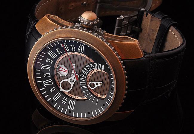 剛剛談到對於金色的誘惑,這跟等下要談的銅金色,可是完完全全不同的境界,雖說,銅是一般很常見的工業金屬,當這材質拿來當錶殼,在早期傳統的製錶業來說,這只是製錶過程前初坏的材質,因為它的材質可塑性高且容易切割加工,早期雖沒有現代科技結合電腦軟體的5軸CNC切割機,但利用機械還是可以鑄成想要的造型,說真的,要不是在1990年初鐘錶設計美學大師Mr.Gerald Genta 品牌旗下所推出的Gefica Safari系列中,大膽採用以青銅做為錶殼材質的錶款,才讓大家知道,原來銅材也可以這樣配置。