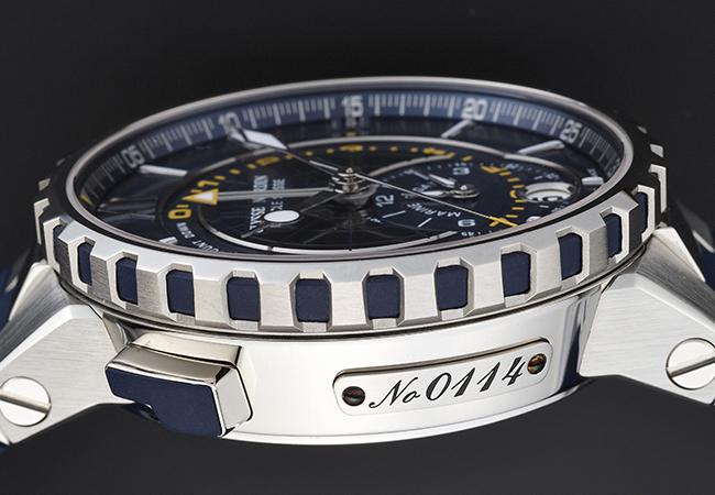 除了象徵海洋的藍面款之外,還有白色面盤的版本、以及一款紀念和Artemis Racing帆船隊合作的黑琺瑯限量版,但相同的是面盤中央倒數計時圈的數字,都是以Artemis Racing的代表色黃色做為點綴,也以鮮明的色調強化了運動感。