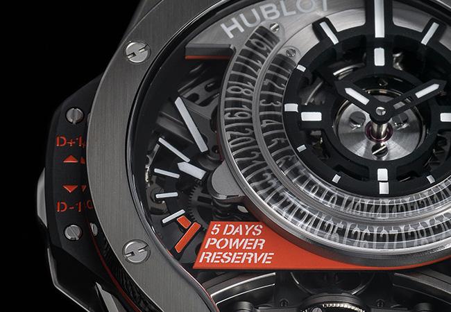 陀飛輪是相對消耗動能的機構,大包小的雙軸陀飛輪更是,此款內裝宇舶自製MHUB9009.H1.RA手上鍊機芯,以雙發條盒創造出長達五日的動力儲存,串連的發條盒,除了延長動力外,理論上輸出動力也更充沛,對於運作穩定也有一定幫助,整體實力不容小覷。