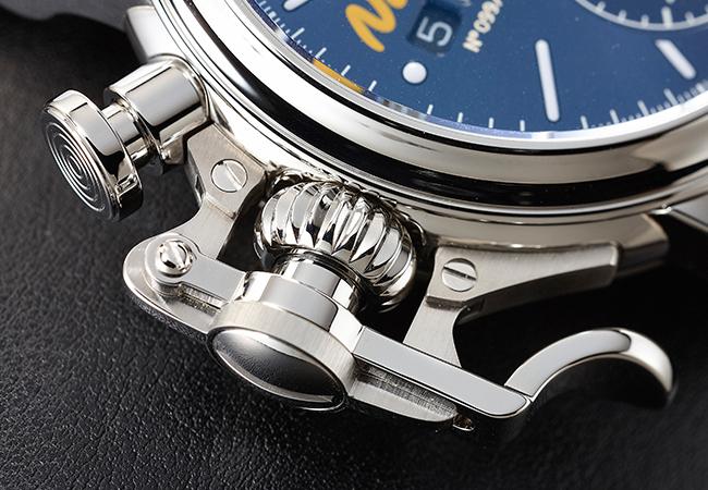 格林漢考量巨大的板機式計時按把置於右側可能會影響配戴舒適度,因此錶款採用左置配置,將機芯180度轉向,也反轉了各顯示功能。而不同於過往,格林漢計時碼錶大多只留下日期顯示,Chronofighter Vintage則將日期星期並列置於九點位置面盤,如此編排讓面盤佈局更對稱妥善。