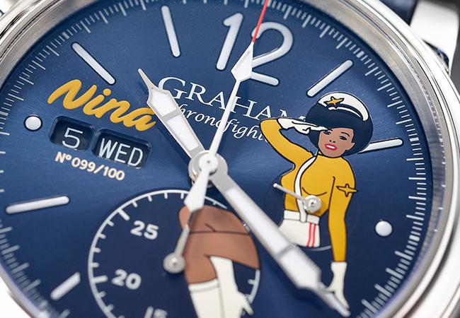 格林漢今年便是以此段戰爭逸事為靈感,將腕錶面盤化為戰機機頭,並繪上Nose Art Bombergirl圖案。推出四款女郎,分別是Nina、Anna、Sally與Lily,各有風情。此款Nina黝黑的膚色,搭配明黃色緊身上衣,更加搶眼。設計善用了三點位置的恆定秒針盤與六點位置的30分鐘計時盤,將之化為兩扇舷窗,女郎側坐其中,並將雙腿伸出窗外,手扶四點位置時標,生動有趣。