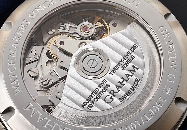 錶款內裝G1747自動上鍊機芯,這是格林漢非常常用的計時機芯,以ETA 7750為基礎修改而成,採用推桿計時結構,以鍛壓的凸輪零件控制計時機構的啟動停止。結構有別於傳統的導柱輪機構,操作反應或許也不及導柱輪敏銳,但結構堅固,保養容易,成本也相對實惠。發表之後成為通用主流,流傳廣遠,也獲得更多優化數據,結構穩定成熟,堪稱為目前最知名也廣受信任的通用計時碼錶機芯,入門品牌到高端品牌錶款皆可見其蹤跡。