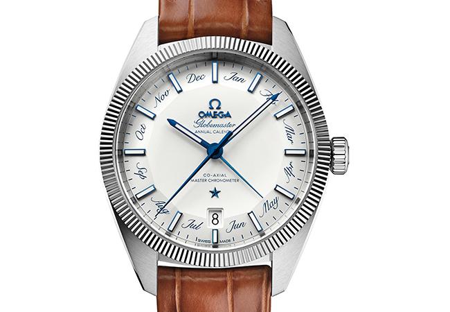OMEGA大師天文台年曆41毫米腕錶採不鏽鋼錶殼與防磨損硬金屬碳化鎢(tungsten carbide)錶圈,是專為情人打造歷久不衰、堅韌柔情時刻的一只腕錶。此腕錶採用蛋白石銀色經典「Pie Pan Dail-多邊型立體」錶盤,其設計靈感取自1952年的星座系列腕錶。面盤上的每個斜面都標記著每一個月份,藉此帶來了年曆功能。面盤上還設置藍色星座系列星形符號與OMEGA商標。藍色亮漆刻面 (blued facetted hands)指針與刻度內填Super-LumiNova超螢光塗層,為腕錶添增迷人光澤。