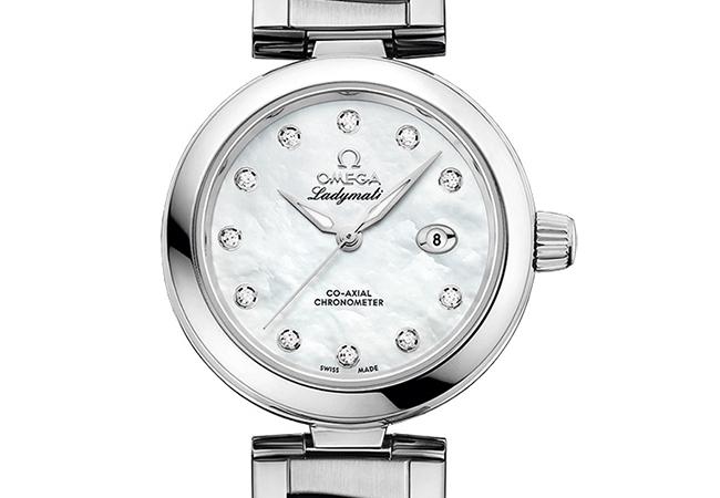 Ladymatic同軸擒縱34毫米腕錶,採用不鏽鋼錶殼及錶鏈,搭配白金拋光斜角「Alpha」指針及11個刻度鑲嵌璀璨美鑽,令腕錶散發出璀璨奪目的無限光芒。精緻迷人的錶盤由白色珍珠母貝製作而成,更彰顯女仕柔美風韻。3點鐘位置並設有日期視窗,而錶的內部核心則搭載 OMEGA 8520同軸擒縱機芯。