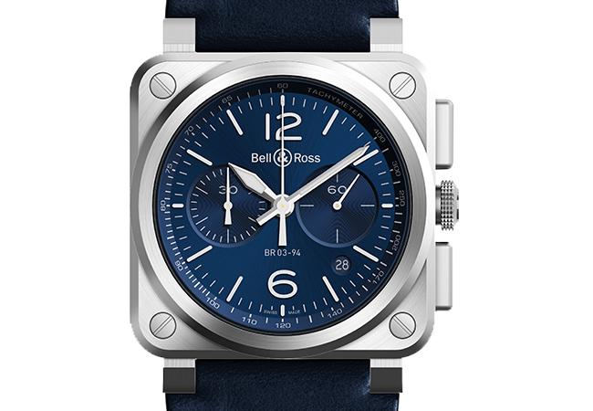 BR03-94 Blue Steel其搭載高度精確的瑞士自動上弦機械機芯,在4和5點鐘之間的視窗中,配有日期功能。腕錶採用品牌標誌性外觀設計,時間顯示漂亮簡潔,指針設計十分獨特:分針更為細長,而時針更寬,以免混淆。錶款更加入了實用性計時功能,兩個計時盤分別顯示60秒及30分鐘累計。