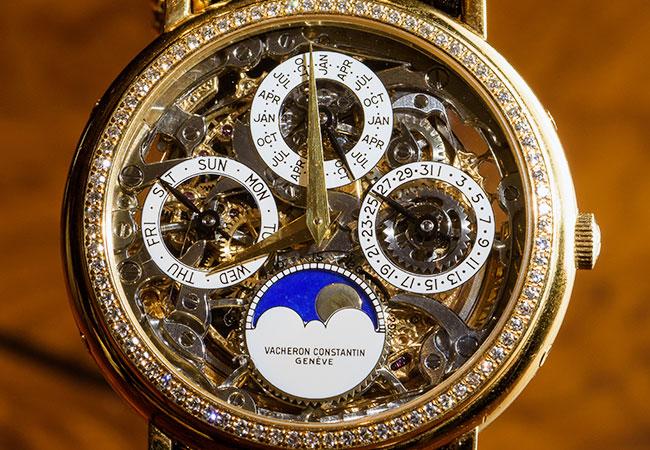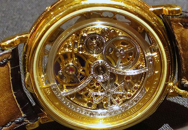 第二款是江詩丹頓鏤空萬年曆腕錶,機芯雖然複雜、零件不少,卻也鏤空得十分錶漂亮。沈理事長翻到錶背說“這是用經典的1120機芯加上萬年曆模組做的,鏤空的骨架上還精雕細琢!”萬年曆模組加在面盤這一側,難以鏤得非常通透,不過,在鏤空之後,萬年曆裝置的各項結構清楚呈現,增添了另一種賞玩之樂。此外,面盤是透明的藍寶石水晶,非透明的文字與刻度部分看起來像飄浮在機芯和鏡面中間,還有點神祕的感覺。