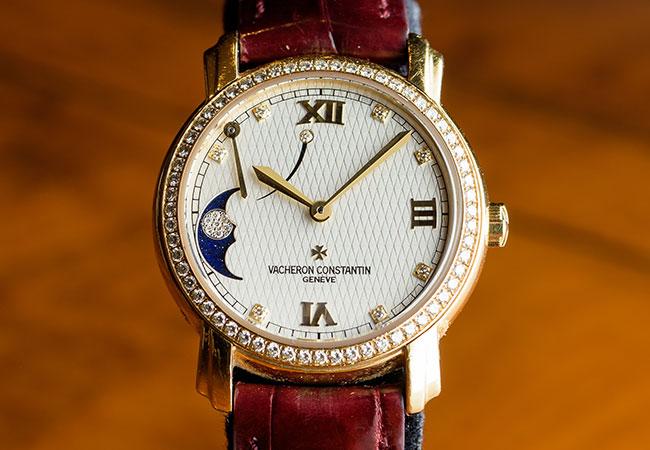 除了沈理事長本身喜歡鐘錶之外,家人也對腕錶有很好的品味。沈理事長拿出一只送給母親的江詩丹頓動力儲存月相腕錶,隨後補充道“單純月相加動力儲存的很少,而且這個月亮還是鑽石做的!” 多數錶款月相盤中的月亮大多是鍍金的,少數是用黃金製作,而像江詩丹頓這樣以鑽石打造的非常少見了。這款江詩丹頓動力儲存月相腕錶最早是在2003年時發表,近年來還有了新的版本,在9月份的鑑賞會上也能見到。