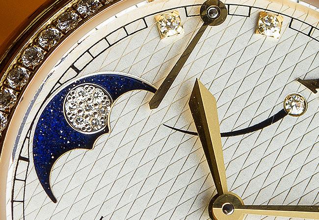 除了鑽石月亮之外,月相碟盤是以金沙石製作,在藍色中映出點點金光,有如暗夜繁星,很有詩意。時、分指針做雙色處理,易於視讀,而菱格紋的雕花面盤則流露大方優雅的氣質。內置的1410手動機芯的上鍊手感很好,藉由動力儲存顯示隨時可以提醒動能是否充足;此機芯還具備了日內瓦優質印記,打磨絕對上乘。月相結構使用較為精密的齒輪比設計,經過122年才會產生一天的誤差。