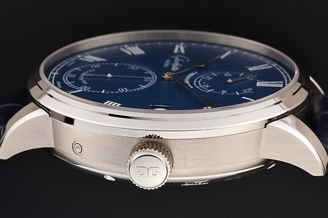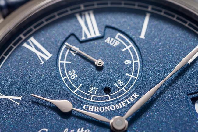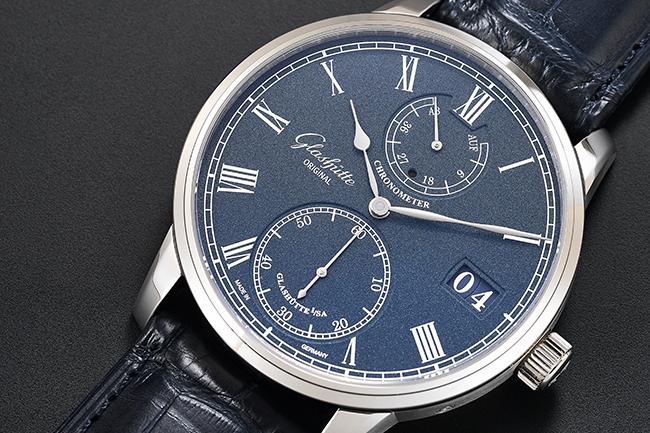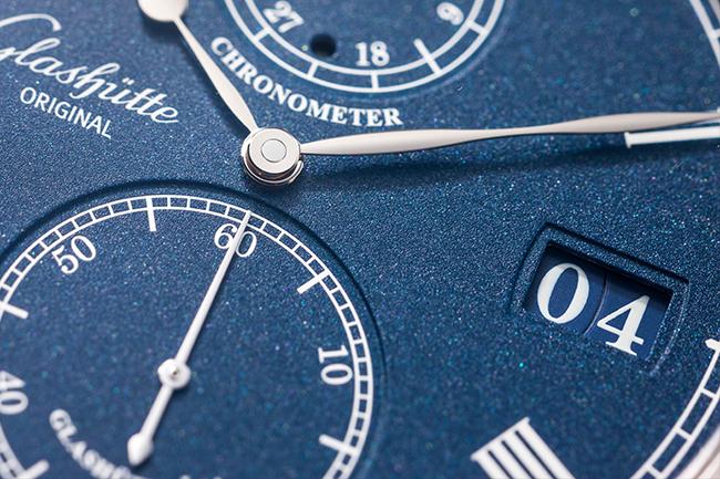 格拉蘇蒂原創的錶款向來走內斂的路線,此款Senator Chronometer議員天文臺腕錶藍色面盤經過L’argenture grainée鍍銀顆粒處理,磨砂般的質感十分柔和。動力儲存指示與小秒針盤微微下凹,除了避免指針相互干擾,也增加面盤層次感。古典的指針經過藍鋼燒製處理,質感也更上一層。面盤三點位置的大日期窗,也當算品牌設計特色,以雙環拼出的大日期窗,中間幾乎不見落差,製作時的高精密度,也從中可見。大日期窗與九點位置的品牌標誌倆相對望,讓面盤佈局更加平穩。