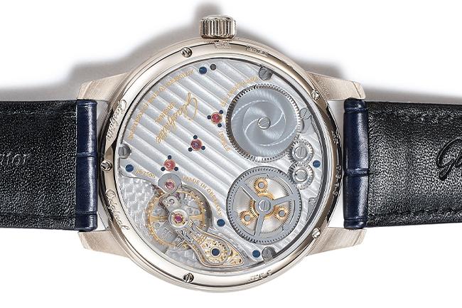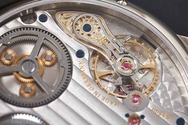 格拉蘇蒂Senator Chronometer議員天文臺腕錶的準確度,來自於期內裝58-01手上鍊機芯,這是格拉蘇蒂所自行研發製作的機芯。板路佈局展現高度德式機芯風格,包括3/4夾板,鵝頸微調等結構。較為大片的3/4夾板,組裝時需先將所有結構輪系都安置妥當,一口氣蓋下。如果稍有不慎,很有可能損壞細緻的輪軸,組裝較一般多片結構困難也更需要技巧。連帶的之後維修保養也有一定難度。但如此構造除了能更明確看清拋光打磨的功力外,整片蓋實,連帶也有更堅固的強度,確實符合格拉蘇蒂原創的務實態度。另一特色,則是以其優美形狀得名的鵝頸式微調。這是種優化過後的快慢針,以螺絲調整加長的快慢針,進而改變游絲長度,調整擺動時間,減少誤差。如此做法也比直接調整快慢針更細膩精準些。但缺點是如此干涉游絲形狀,時間一長,可能會造成變形,反而增加誤差。不過對於導入電腦運算、精密機械製作,誤差大減的現代製錶來說,鵝頸微調的主要意義,該當還是在於所代表的傳統德式製錶內涵,以及美觀(尤其進一步加上細膩雕刻之後,感覺更為精緻)。