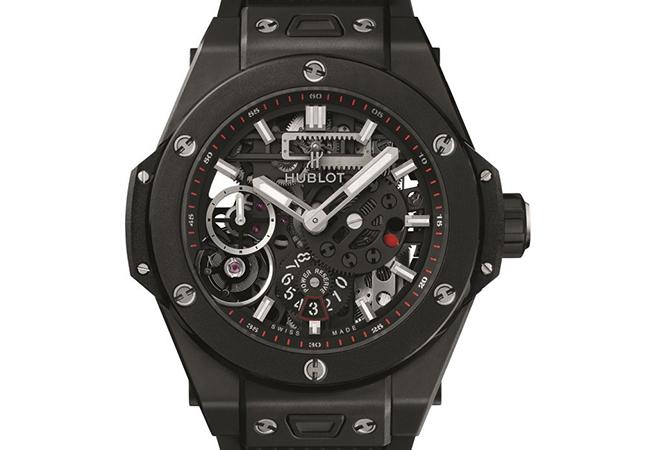 HUBLOT宇舶錶自製機芯Big Bang Meca-10家族再添一員生力軍-Big Bang Meca-10 十日鍊魔力黑陶瓷腕錶(Big Bang Meca- 10 10-Days Power Reserve Black Magic)。錶殼由黑色陶瓷製成,搭載百分百自行設計及研發的HUB1201機芯,手上鍊、鏤空設計,具有十日動力儲存,由223枚精密零件所組成,其中包括各種造型極為複雜細緻的金屬連桿、冠狀輪、齒條、機板與橋板、樞軸與棘輪等等。