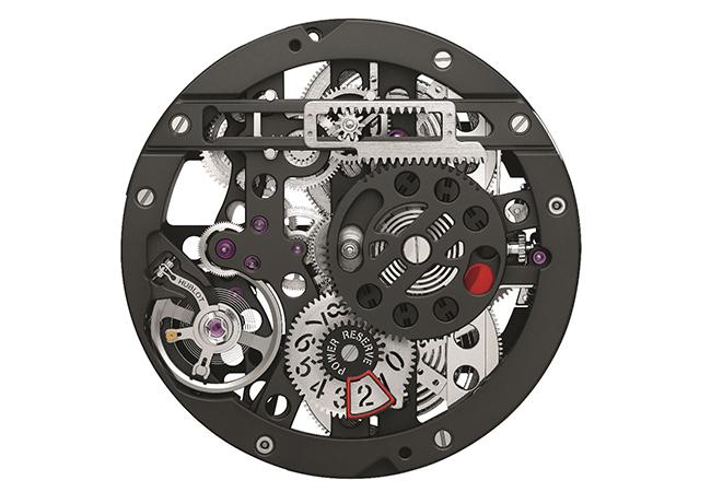 面盤採鏤空設計,可以透視7點鐘位置的擺輪系統。Meca-10 (HUB1201)機芯擁有強大的動力儲存,為來將可添加其他模組、拓展機芯的易行操作。