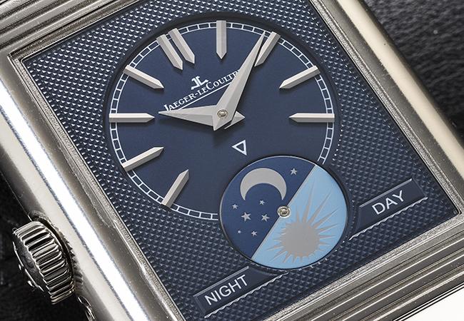 翻轉錶殼的背面,以Duo雙時區設計概念顯示第二時區時間,就如Reverso Tribute系列中的其他腕錶一樣。背面的第二面盤採用深藍色設計,面盤外緣採用巴黎釘紋(Clousde Paris),中央面盤則為霧面粒紋,其中央的兩地時間指針,可透過撥動翻轉錶殼頂端的滑桿,來快調短時針,使用上可說是相當便利。而六點鐘位置則是採用太陽與月亮圖案的日夜顯示轉盤,可指示第二地的白晝與黑夜狀態。