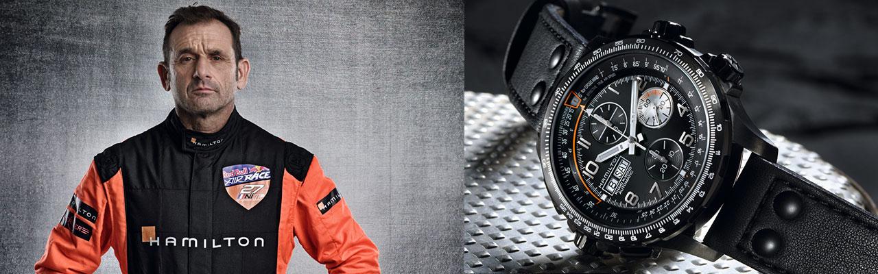 漢米爾頓御風者系列,機芯搭載中央計時碼表功能,透過顛覆傳統機芯的倒置創意,以雙錶冠驅動面盤滑尺與運算滑盤,用以監測油量耗損與換算安全爬升高度,令飛行員失去塔台引導時,依然可倚靠腕錶,做為安全返航的重要助手。