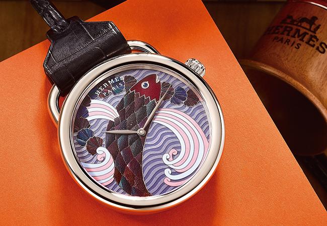 2017年愛馬仕以絲巾圖案為發想,設計出一款飛馬圖案,再以麥稈工藝為技法,打造出Les facéties de Pégase麥稈鑲嵌藝術腕錶,幾何拼接的繽紛面盤。
