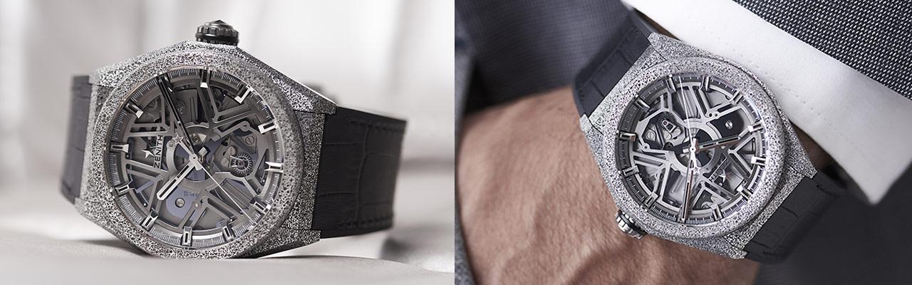 Defy Lab錶殼直徑44mm,是首枚採用世界上最輕的鋁合金材質─Aeronith打造的腕錶。全新材質經獨家高科技製程打造,這種極度堅固的發泡金屬具1.6 kg/dm3低密度,不只比鈦金屬輕2.7倍、比鋁金屬輕1.7倍,更較碳纖維輕10%。