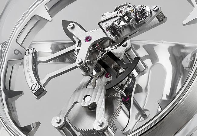 而第三個視覺焦點,是Octopod的機械裝置如何謎樣地懸浮在那水晶般通透的球體中,讓它看起來就像漂浮於太空(或像在水中悠游)。機芯的底盤以雙面塗飾抗反射塗層的透明玻璃組成,因此幾乎察覺不到它的存在。就像章魚透過偽裝掩護自己,Octopod也以獨有的視覺遊戲,隱藏部分的自己。Octopod的八日動力機芯為L’Epée 1839全新突破,無論是玻璃底盤或是巧妙平衡的調速器均充滿嚴峻挑戰。