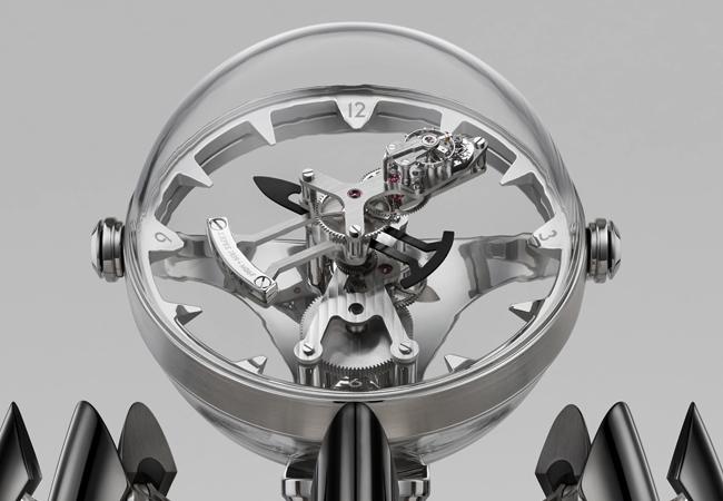 首先映入眼簾的,是 Octopod透明球體維持平衡的方式,與傳統航海天文鐘如出一轍。差別在於傳統天文鐘採用的是雙軸平衡,而Octopod僅需單軸即可,此設計讓天文鐘能在顛簸的船程間維持水平位置。在Octopod的鐘殼內,穩定環架 (gimbal) 能確保Octopod球體在任何角度及高度都能順暢轉動,讓內部的時間顯示能以最易讀的角度呈現。