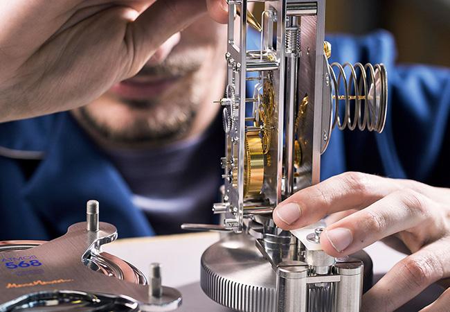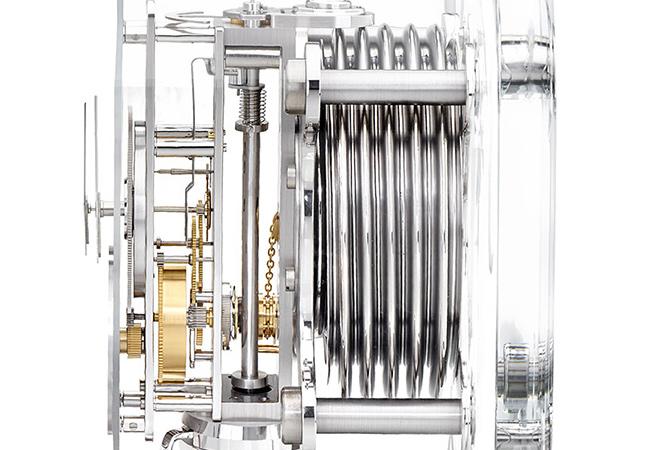 品牌代號568型空氣鐘機芯(機芯由211枚零件組成),是一枚以人手製作和組裝並裝置傳統的圓形擺輪(盤),但是特別的是這組擺輪每60秒擺動一圈,可說是相當的慢擺,因為上述結構的動能傳輸,它並非如傳統座鐘擺輪那樣的炫麗活跳跳的生命力呈現,反之,它是那樣徐徐的慢活著,說真的,觀看空氣鐘的運行,也是種可以沉澱心靈的享受。在功能上,錶盤上可以看到時、分及最下方月相顯示,最重要的還是最底部的那組擺輪,相當值得細細的品嚐時間的美感。