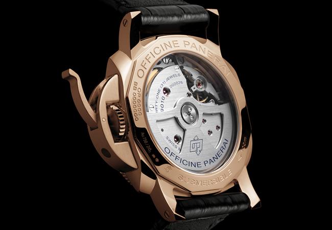 透過旋入式的透明底蓋,可以窺見新一代的自動機芯P.9010,其厚度較先前的P.9000自動機芯減少1.9mm,因此可使錶殼本身更為輕薄;機芯本身延續沛納海常見的雙發條盒設計,因此具有72小時的動力儲存。至於螺絲微調平衡擺輪以及自由收放游絲,同樣是沛納海自製機芯的標準規格,並且具有停秒功能。而使用者亦可透過拉出錶冠第一段,快速調整短時針,適合出國旅遊以及商務人士配戴。