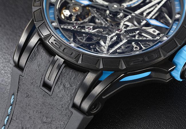 而Excalibur Spider創作概念的運用,將羅杰杜彼的獨特鏤空技藝延伸到機芯之外,如錶圈和盤緣等外部元素,為這些錶款提供了具有象徵意義的色彩組合。廠方採用鈦金屬來製造錶殼,主要著眼於輕盈堅固的特性,但是為了強化錶款的設計風格,廠方採用黑色DLC類鑽碳鍍層,其表面的硬度遠超越陶瓷,因此不一刮傷,同時錶款能兼具輕盈的特性。除此之外,錶最大的賣點之一,便是廠方將過去冠軍車輛所使用的輪胎,切割其表皮之後,安裝在橡膠錶帶上,其錶帶背面還會印有冠軍賽車輪胎上所鐫印的真實編號。