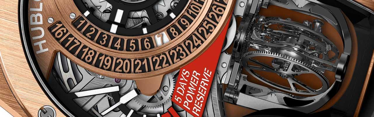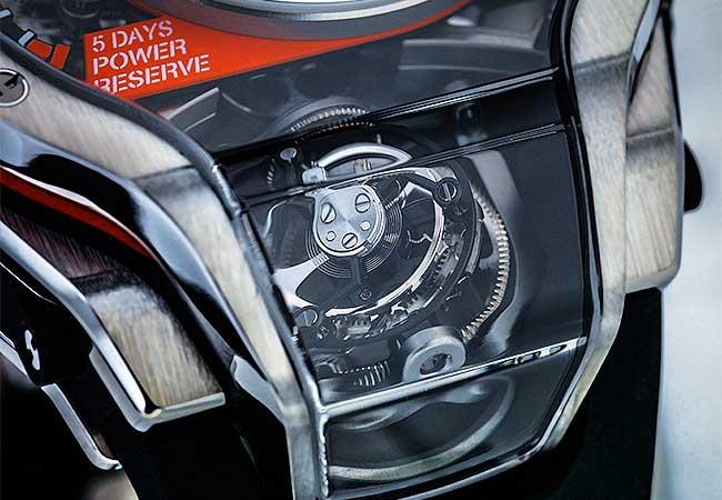 綜觀MP系列的發展,每款都是在挑戰製錶工藝的可能,此款MP-09所挑戰的,是品牌首度涉獵的多軸陀飛輪。自製的MHUB9009.H1.RA手上鍊機芯,具備偏心時分指示,特殊的瞬跳日期顯示形式,五日動力儲存等功能。