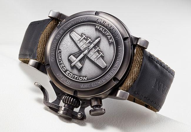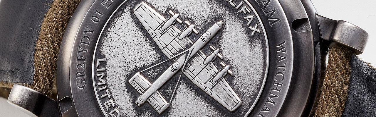 此款綠色計時指針款的不鏽鋼底蓋鐫刻英國皇家空軍哈利法克斯轟炸機圖騰,連結英倫風味也強化此款復古飛行軍風的特質(其他款則採透明底蓋)。內裝G1747自動上鍊機芯,是由ETA 7750為基礎修改而成。這可說是目前最具知名度也頗有口碑的通用計時碼錶機芯。經過不斷優化,結構成熟,許多品牌都有採用此枚機芯而如此,甚至有以此為基礎加裝模組成為複雜功能的作品。