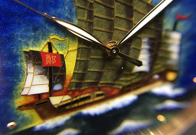 這場琺瑯工藝展的主角就是Classico Zheng He鄭和寶船腕錶,因此文章一開始就要好好來介紹它。第一眼看到它,就會被面盤上的鄭和寶船給吸引,其可是比照真實的鄭和寶船來設計。現實生活中的鄭和寶船長137米,寬55米,共有4個甲板,最多可容納400人,對於當時明朝在拓展與南洋的貿易交流扮演的重要的角色。