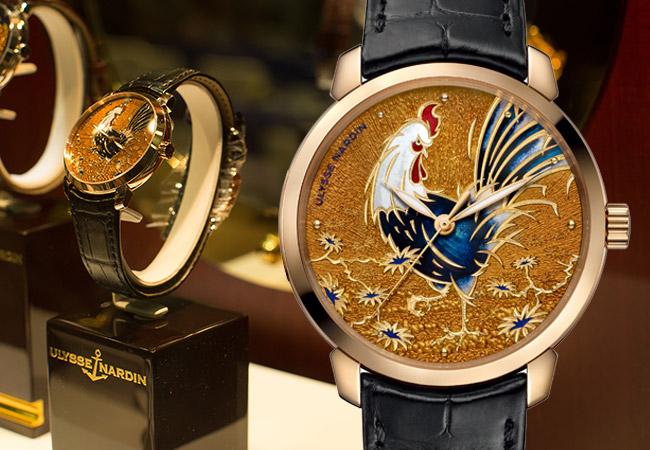 雅典錶近來每年也會推出生肖腕錶,像是今年就推出了《鎏金金雞》腕錶,使用內填琺瑯製作,其原理是先將圖案紋理用鑿子在金屬面盤上雕刻出凹槽,之後再將琺瑯釉調和液填入,不同的金屬氧化物會提煉出不同的色調,經過高溫烘烤燒製定色,並將面盤拋光磨平。最後最後也是一道很關鍵的工序,雕刻師必須再次雕刻所有金屬分隔線,增加視覺上的層次感。
