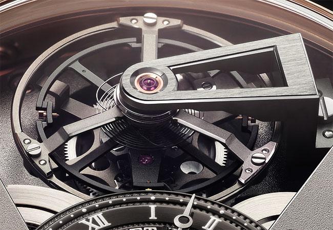 從正面看的話,時、分針盤設於7時位置,與之緊鄰的是1時位置的超大型陀飛輪,此陀飛輪使用輕量化的鈦金屬擺輪並搭配防磁的寶璣雙層矽游絲,上框架也以鈦金屬製作,不論在視覺美感或是效率、性能方面都可圈可點。