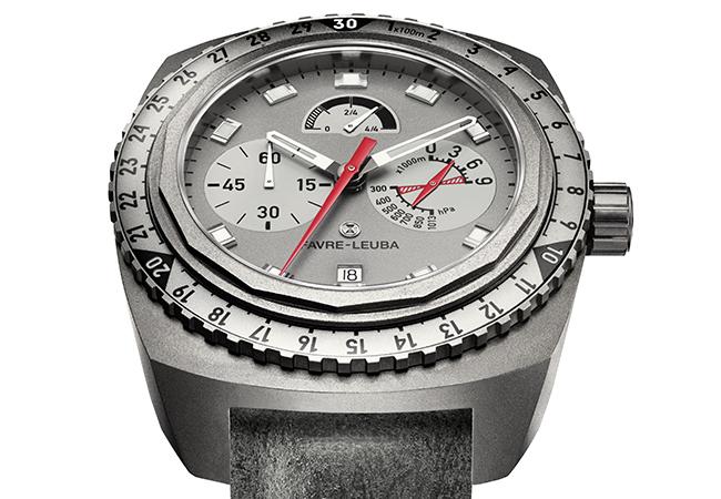 設計Bivouac 9000之時,Favre-Leuba 從品牌的傳奇錶款擷取靈感,以現代角度詮釋品牌經典設計元素。同時,這款錶必須在任何狀況下,清晰顯示時間,錶盤設計極為低調,讓整體有足夠面積放置兩枚大面盤,三點鐘位置顯示氣壓,九點鐘位置小秒針盤,再以對比色的圓弧視窗顯示動力儲存。螢光時針與分針,以及立方時標,搭載於低調石灰錶盤上,清晰可見。而中央的深紅測高指針,肯定是面盤上最耀眼的一顆星。Bivouac 9000腕錶,豪邁的規格也吸引目光 – 厚實的錶殼直徑為 48毫米,以輕質,耐用,抗過敏的鈦金屬材質製造,規格豐富,相對輕巧舒適。